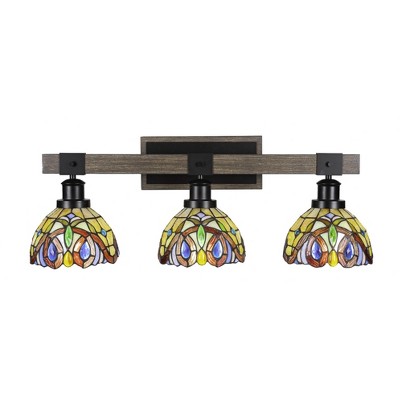 Collection: Tacoma, Material: Steel, Finish Color: Black/Painted Wood, Height: 10.25", Length: 27.5", Depth: 7.75", Backplate Width: 10", Backplate Length: 4.5", Lamping Type: Incandescent, Number Of Bulbs: 3, Wattage: 100 Watts, Dimmable: No, Moisture Rating: Damp Rated, Desc: Tacoma 3 Light Bath Bar In Matte Black & Painted Distressed Wood-look Metal With 7� Sea Ice Art Glass,-Tacoma - 3 Light Bath Bar-10.25 Inches Tall and Inches Wide-Black/Painted Wood Finish-Zion Art Glass Color