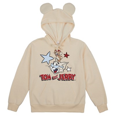 • GRAPHIC DESIGN: Tom chases Jerry across the front of this hoodie while black letters with red outlines repeat the words, "Tom and Jerry," in the background. Fans of the cat and mouse cartoon duo will love this design.