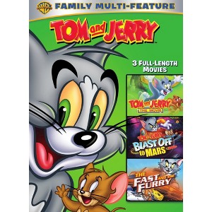 3 FUN-FILLED FAMILY FAVORITES! wild cat-and-mouse escapade full of thrills and adventure like you've never seen. Tom and Jerry Blast Off to Mars: Tom & Jerry mistakenly stow away on the first manned mission to Mars and discover we are NOT alone! Martians do exist! The furry duo must join forces with a young Martian girl to battle asteroid fields, the Martian invasion of Earth, and a gigantic alien robot bent on destroying anything & anyone in its path. Tom and Jerry The Fast and the Furry: Tom and Jerry enter an extreme car race competition called the "Super Race" in order to win the grand prize of a beautiful, dream mansion! Driving suped-up hot rods that can adapt to any environment (land, sea or air), they compete in this wild race around the world, encountering famous landmarks along the way and leaving chaos in their wake. Tom and Jerry The Movie: Tom and Jerry return to the silver screen in a magical, music-filled extravaganza! The celebrated cat-and-mouse team meets Robyn Starling, a runaway who desperately needs their help to find her missing father. Despite heroic efforts, Tom and Jerry are captured by Robyn's nasty Aunt Figg and her lawyer Lickboot, then tossed into pet prison by the villainous Dr. Applecheeks. Tom and Jerry brilliantly mastermind a great escape and free their new friends, Puggsy and Frankie Da Flea. Together with Robyn, they set off on a