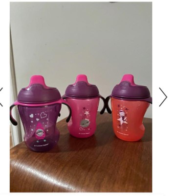 [This review was collected as part of a promotion.] These Tommee Tippee sippy cups are so cute. They come in a pack of three different colored cups. They are easy to wash. They have fun animal patterns on them. The handles are also removable. They're easy to hold and easy to use.
