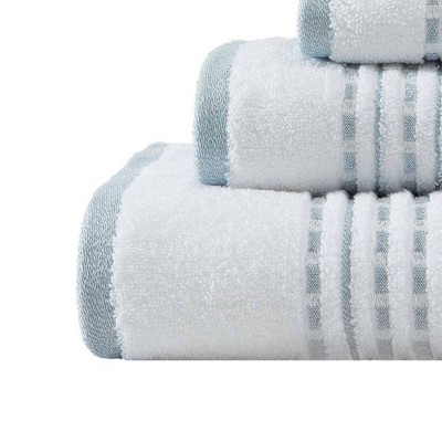 [This review was collected as part of a promotion.] This towel set has a timeless and effortless look that goes so nicely with my bathroom decor. I love that the towels are super soft 100% cotton that are very absorbent. The three sizes of towel are nice and convenient for any bathroom. The grey trim is subtle and not something I will tire of.
