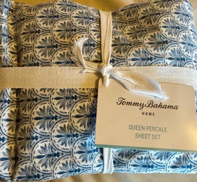 Add beautiful coastal inspired print to your bedroom with a new printed sheet set from Tommy Bahama. Featuring a simple pinstripe design, these sheet sets are great for easy layering with your favorite bedding. Providing quality cotton construction, these sheets are crisp and breathable, perfect for a great night's sleep. Pair these amazing sheets with a new Tommy Bahama comforter set or assorted Tommy Bahama décorative pillows to create a unique coastal getaway right in your home. The included fitted sheet features a deep pocket and fits mattresses up to 18" deep. Set includes one flat sheet, one fitted and two pillowcases. Sheets and pillowcases are machine washable for easy and convenient care.