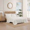 The Tommy Bahama Palma Stripe cotton sateen sheet set features elegant earth inspired green stripes on a soft white ground, creating a sophisticated and clean look that pairs beautifully with any Tommy Bahama classic. Made from long-staple cotton with a 300-thread count and a lustrous sateen weave, these sheets offer a super-soft, silky feel that becomes even softer with each wash. Available in queen, and king sizes, this set brings both comfort and style to your bedroom. The fitted sheet features a 15" deep pocket, ensuring a snug fit and keeping the sheet in place. Machine washable for easy care, this sheet set effortlessly combines elegance and practicality, making it a timeless addition to your bedroom.