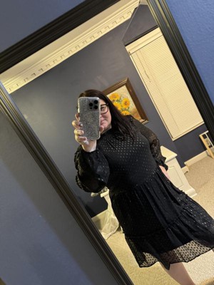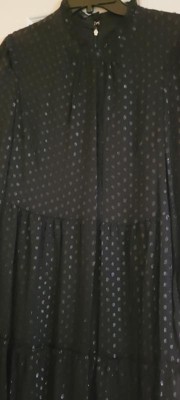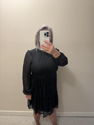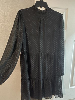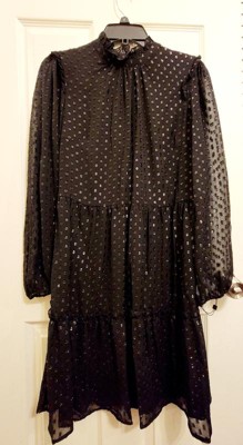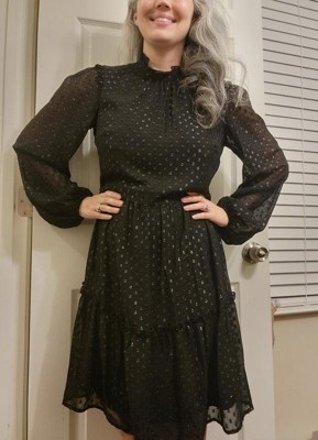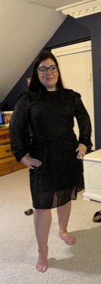 [This review was collected as part of a promotion.] Absolutely love this little black dress!!! It's sparkly but not in an obnoxious way. The design is on trend with the dots, high ruffled collar & puffy sleeves. It's also very comfy & breathable. I'm 5'4, 115 lbs, bought a size 4 & it hits just below my knees. <3 <3