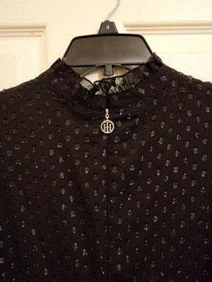 [This review was collected as part of a promotion.] The Tommy Hilifger Glitter Dot Chiffon dress would make an adorable party dress. If you want a more fitted look size down & if you’re going for a flare order your normal size. The sleeves are a sheer with the glitter dots. The neck is high with a sweet ruffle. The dress is very flattering. It is dry clean only.