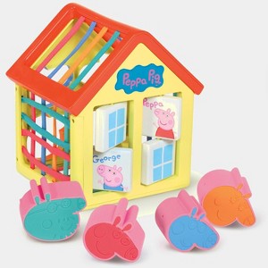 All the fun is happening at Peppa Pig’s house! Now you can discover what lies behind those familiar walls, with all kinds of fun and surprises waiting around every corner of this activity center. Fans of the Peppa Pig show will know they’ve come to the right place, but what will they find behind each of the four windows? Give them a spin and see who’s hiding inside. Around the back of the house is a shape sorting game. The colors provide a hint, so match these and you’ll soon be putting Mummy Pig and Daddy Pig in their place, along with Peppa and little brother George.