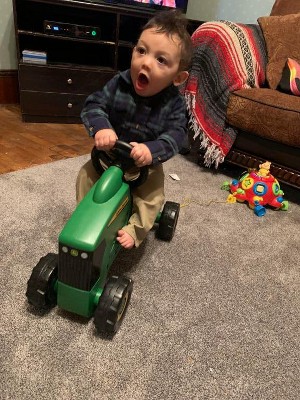 [This review was collected as part of a promotion.] My little one LOVES this tractor! He is a little over a year old and it is perfect for him! It is very stable and low enough to the ground that he can reach the ground to push himself. He can't walk past it without wanting to get on it. My other kids (4 and 6) also think it is fun and enjoy riding it and pushing each other on it. I would definitly reccomend this to everyone. It looks just like the tractors that are working in the fields. Boys and girls both enjoy this toy.