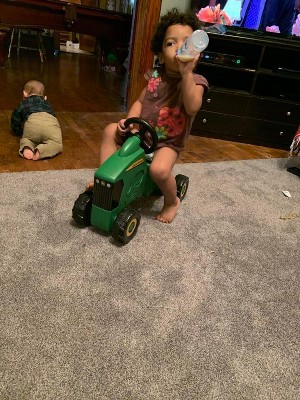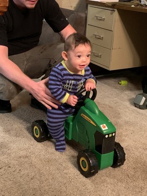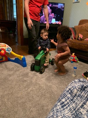 [This review was collected as part of a promotion.] We found this toy to be perfect for our two small children. My 7 month old (boy) could sit on it and daddy could push him around while holding onto him and my (almost) 2 year old (girl) rode around for hours. We enjoyed that the ride on John Deere tractor didn't have any lights or distracting components like other ones. Just hop on and go! It was very easy to put together and my 2 year old got soooo excited when we were putting it together. It's a perfect addition to any farm themed role playing we do. We have another ride on toy, but our kids seem to prefer this one better.