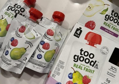 - KIDS SNACKS MADE WITH REAL FRUIT: Four 3.5 oz Too Good & Co. Pear Berry Pouches made with real fruit and found in the yogurt aisle