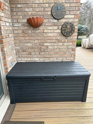 [This review was collected as part of a promotion.] Very durable storage container! It fits a lot of the items we were looking to store such as additional patio chairs that fold up. It wasn’t too difficult together and looks great on our deck!