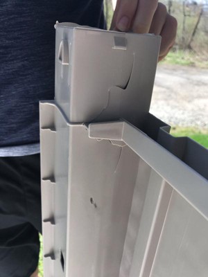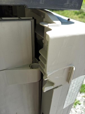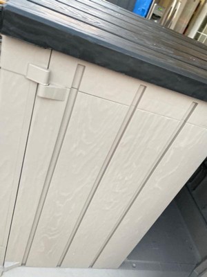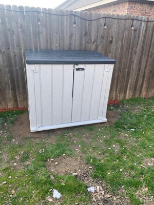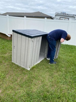 [This review was collected as part of a promotion.] This is a decent storage shed. I will say that some of the plastic was cracked and you need a rubber mallet and towel to help make everything fit without breaking the plastic. It does hold a large amount of items and would be great for concealing trash cans. I can’t attest to weather resistance, yet, but it seems to be sturdy once assembled. Took two people about 30-45 minutes.