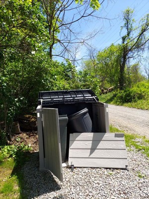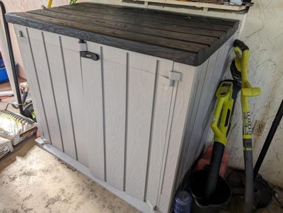 [This review was collected as part of a promotion.] This storage container is easy to put together, mostly a friction fit with just a handful of screws for the latching mechanism (that includes an area for a lock if needed). You can fit SO much in here! Children's ATVs, medium sized lawn equipment like blowers, weeders or shovels, and tons of gardening supplies. Gloves, spades, hand rakes, bags of garden soil, top soil, potting soil, seeds, water cans, you name it. It's sturdy, too. It can handle a decent amount of weight from the front, top and sides. There are also two ways to open it - from the top and from the side! As a bonus, it makes a great cat stand LOL! For an easy storage solution to take things out of sight and tidy up a back porch this is a great option!