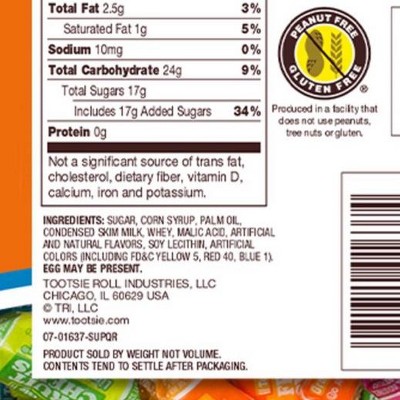 sugar, corn syrup, palm oil, condensed skim milk, whey, malic acid, artificial and natural flavors, soy lecithin, artificial colors (including fd&c yellow 5, red 40, blue 1).' '