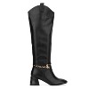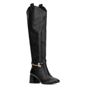 The Elenora boot redefines traditional riding boots with its unique design. Featuring a stylish curved collar, it offers a sophisticated twist on the classic look. The round toe ensures comfort for all day wear, while the zigzag block heel adds an edgy, modern flair. An exquisite metallic accent further elevates the boot's overall appeal, making it stand out in any wardrobe. Perfect for those who want to blend timeless style with contemporary details, the Elenora is a true statement piece.