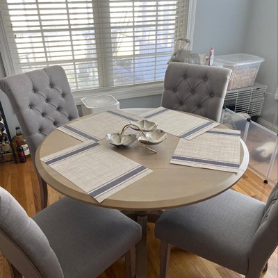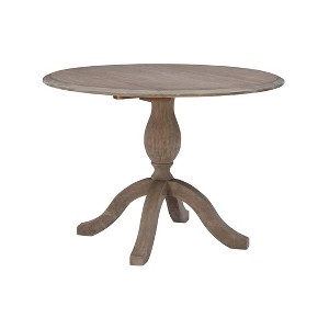 Elevate your dining experience with the versatile charm of this dual drop-leaf dining table. Crafted with a sturdy solid wood pedestal, this rustic yet refined piece features a textured grey wash finish that effortlessly complements any interior style. Whether you're going for a classy, streamlined look or a more casual, mix-and-match vibe, this table adapts beautifully. When collapsed, it’s a sleek space saver at 24 inches, ideal for displaying decorative items, and can expand to 42 inches to comfortably seat up to four. The gracefully curved lines of the base and feet enhance its aesthetic appeal, making it a stunning addition to any small kitchen or dining room.