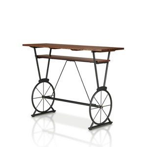 Serve up a plate of light refreshments or catch up with your family and friends over this cozy counter height table, a perfect stylish addition to any home. This counter height table features a gorgeous solid wood tabletop with a wood veneer finish that is supported by a sturdy metal frame in a sleek black color. Offering a homey appeal to your decor, this table showcases exquisite wheel-shaped inspired legs that emphasize the farmhouse design of this piece, making this the ideal centerpiece for your dining space area.