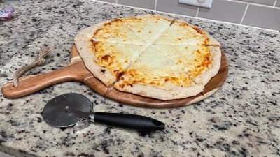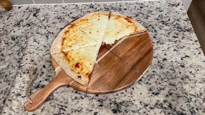[This review was collected as part of a promotion.] My husband and I grew up in NY and CT but now live in CA. Although we love it here, the local pizza just doesn't do it for us, so I always make my own. This gorgeous pizza board adds that special visual touch that makes us feel at home. Made of beautiful wood and impeccably sized with cut outs to guide slicing, it looks like what we would see the proprietors of our favorite Napoletana pizza shop using to pull our pie out of a wood brick oven. Although we don't have our own wood brick pizza oven (yet), this beautiful cutting board gives our homemade pizzas that authentic and classy look. It is also practical, as it is perfectly sized, so I no longer have to scratch up my pizza pans when slicing. After finishing the pizza, the board also cleans up easily. The strong rope on the handle for hanging is perfect for displaying the lovely craftsmanship of this pizza board out in the kitchen, where it looks rustic yet nice enough to be a decoration despite how useful it actually is. This exceptionally well-made product will get a lot of use for years to come.