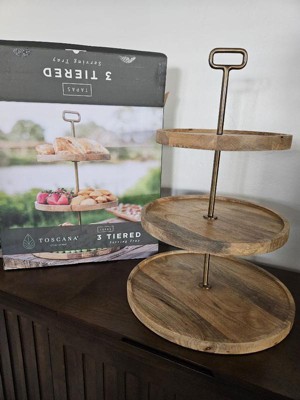 [This review was collected as part of a promotion.] I was lucky enough to get this beautiful 3 tier serving tray complimentary in exchange of an honest review. Wow! This is very well made. The wood is beautiful and sturdy and can hold a decent amount of things. It does not need to just be for food. It will also be great to hold knick knacks to decorate a centerpiece. It was packed well inside the box and it is easy to assemble. The little edges on the side make sure nothing falls out. I love that it is spacious and will allow for multiple hands to grab something at the same time. Love!