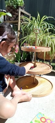 [This review was collected as part of a promotion.] This is a nice three tier serving plates ! It is also tall (pictured here with my 5 year old for scale ). Also easy to detach , or just put up on the counter to display your fruits. I haven't had the opportunity to serve a party with it, but I am sure this is an amazing addition to the charcuterie table. It will hold a lot of items and also save space. It is made of Mango wood, and had a slight sappy,woody odor when I opened the box, but the smell disappeared after airing it out.