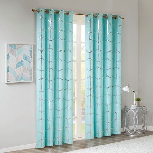 Freshen up your space with the enchanting style of Intelligent Design Raina Window Panel. The stunning panel flaunts a geometric, metallic silver print against a vibrant aqua ground for a fun and eye-catching look! Finished with a heavy 3 pass foamback liner, this panel is 100% total blackout providing energy efficiency and added privacy. Grommet top makes this panel easy to hang, open, and close through the day. Machine washable for easy care; complete the collection with coordinating bedding and shower curtain sold separately.