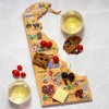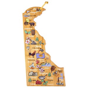 Celebrate life in The First State with the Totally Bamboo Delaware State Shaped Cutting Board with Artwork by Fish Kiss! This board features beautifully illustrated artwork by Fish Kiss of all the top towns and attractions in the state. A fun and unique choice as a charcuterie board, you and your guests will love reminiscing about all of your favorite places featured on the board. Before serving, flip the board over for use as a knife-friendly bamboo chopping board on the blank back side. When not in use, the included hang tie allows the board to easily double as wall art. The artwork is applied using a specialized UV printing technique that's safe for food contact and will maintain its beautiful color. Caring for the board is easy; simply hand wash with warm water and soap. It also makes a great gift for anyone that's a fan of the state!