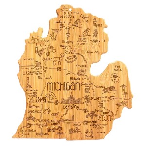 Celebrate life in The Great Lakes State with the Totally Bamboo Destination Michigan State Shaped Serving and Cutting Board! This beautifully crafted bamboo cutting board is shaped to the unmistakable outline of the Michigan mitten, and features laser-engraved artwork of all the top cities, places and attractions. It's a great way to add a bit of local flavor to your charcuterie or appetizer spread. The reverse side of the board is blank and provides an ideal, knife-friendly cutting surface. When not in use, the included hang tie allows the board to double wonderfully as wall art to show off your love of Michigan in the kitchen, dining room or den. The Destination Michigan Board also makes an outstanding gift for birthdays, housewarmings, Christmas or any occasion! Hand wash only; measures 11-3/4" x 13-1/4" x 5/8".