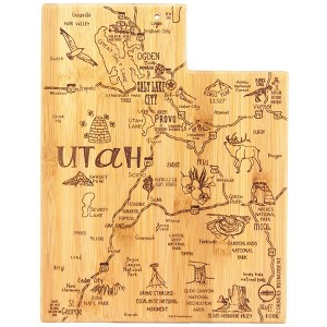 Celebrate life in The Beehive State with the Totally Bamboo Destination Utah State Shaped Serving and Cutting Board! This beautifully crafted bamboo cutting board is shaped to the outline of the great state of Utah, and features laser-engraved artwork of all the top cities, places and attractions. It's a great way to add a bit of local flavor to your charcuterie or appetizer spread. The reverse side of the board is blank and provides an ideal, knife-friendly cutting surface. When not in use, the included hang tie allows the board to double wonderfully as wall art to show off your love of Utah in the kitchen, dining room or den. The Destination Utah Board also makes an outstanding gift for birthdays, housewarmings, Christmas or any occasion! Hand wash only; measures 14-1/4" x 11" x 5/8".