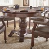 Create lasting memories with family and friends with this Tournament Dining and Game Table from Steve Silver Co. Designed in a round shape, this brown dining and game table seats up to four people, offering a great space for poker, family dinner or casual cocktails. The removable gaming tabletop features a brown faux-leather center — perfect for a variety of card games — surrounded by a sectioned border with cup holders for extra convenience. Made with a four-point pedestal base, this wood-frame dining and game table easily converts to a refined dining surface, making it a multipurpose addition to your home.