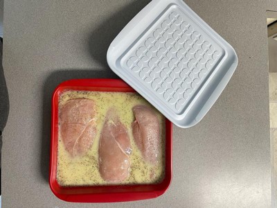 [This review was collected as part of a promotion.] This is super convenient for prepping meats and veggies. It’s spacious, seals well, and makes flipping food mess-free. I like that it’s reusable and easy to clean, which saves on plastic bags. The lid fits snugly, so I can stack it in the fridge without spills. However, the plastic feels a bit flimsy, and I worry about long-term durability. It also stains a little with strong marinades. It's a practical tool that makes marinating easier and tidier, but I’d love a sturdier version that holds up better over time.