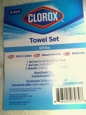 [This review was collected as part of a promotion.] The Clorox Towel Set, comes with two Bath size towels: ( 30X52) ; two Hand size towels ( 16X26 ) ; and two Wash size towels , (12X12) , for a six towel set. These towels are so bright white and of course are bleach friendly. Going are the days of having to match bath towels to hand towels to wash towels Clorox has done this for you.