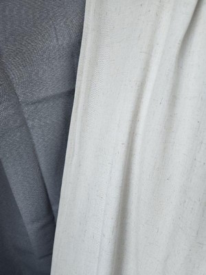 [This review was collected as part of a promotion.] These curtains are very pretty. They have a linen-look with grains of gray on them even though they are made of only 13% linen and 87% polyester. They are easy to put up with big ring grommets. These curtains are room darkening, so they don't block the sunlight all the way. They also have a second layer of a darker color liner attached on the side that faces the window for thermal insulation. They washed and dried well in a machine on a regular cycle.