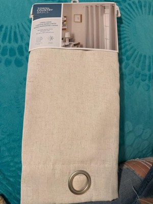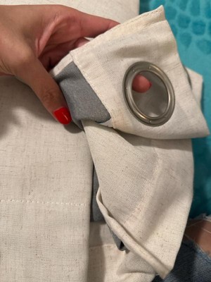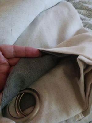 [This review was collected as part of a promotion.] These curtains are very pretty. They have a linen-look with grains of gray on them even though they are made of only 13% linen and 87% polyester. They are easy to put up with big ring grommets. These curtains are room darkening, so they don't block the sunlight all the way. They also have a second layer of a darker color liner attached on the side that faces the window for thermal insulation. They washed and dried well in a machine on a regular cycle.
