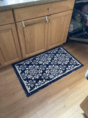 [This review was collected as part of a promotion.] The first thing that I noticed is that this rug is the perfect size for either a Kitchen or an entryway . It has a non-slip bottom. The design is vivid colors of white and blue. It’s a very pretty addition to an entryway or bathroom, or even in your kitchen. I put mine in my kitchen, and it is very comfortable to stand on while I do dishes. I spilled on it a little bit, and I was pleased to find that clean up was super easy because of the low pile fibers . It’s a machine washable decorative rug and is crafted from 100% super soft woven loop polyester, giving a luxurious feel while withstanding high-traffic areas with its durable construction and non-slip latex backing. I highly recommend this .