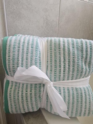 [This review was collected as part of a promotion.] I really like these bath towels. They wash up well and are soft. They are huge 30 by 58 inches. Very absorbent and made of cotton. I am new to this brand and love it. I want to get more just like these four. The packaging is amazing with it tied up with a ribbon. They have a hook to hang them that is sturdy and this is a great value and are striped and reversible. Very durable.
