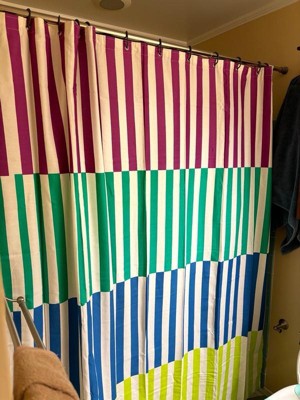 [This review was collected as part of a promotion.] I was super excited to put these shower curtains in my bathroom which arrived at the perfect time now that the weather is warming up in NYC! The colors work perfectly together in their block style layout! Look amazing and the material is great and durable! The 60/40 blend of cotton and polyester hold up very nicely! 10/10