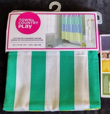 TOWN & COUNTRY PLAY Adeline Offset Stripe Cotton-Rich Breathable Fabric Shower Curtain with Anti-Rust Grommets, Purple/Green/Blue, 70"x72"