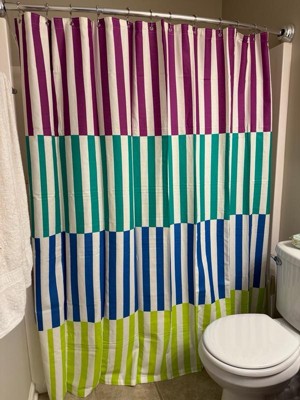 Go bold with your bathroom design by adding a Town & Country Play shower curtain into your space! With vibrant colors and a playful pattern, this Cotton-rich, fabric shower curtain will instantly transform any shower or bathroom. The Adeline Offset Stripe 70â€ÂÂx72†shower curtain offers a colorful, modern look with durability to last. Made with strong, reinforced top hem stitching and anti-rust grommets, this striped shower curtain is ideal for busy households and kid’s bathrooms. Machine washable as needed for easy care. Use with waterproof shower liner recommended.