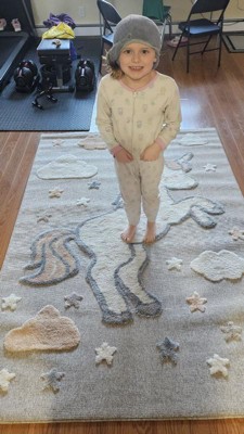 [This review was collected as part of a promotion.] I am absolutely delighted with this product of the TOWN & COUNTRY PLAY Starlight Unicorn Dream Kids Area Rug in beige/multi color, 5'2"x7'2" size. The material of this rug is truly exceptional - it's so soft and plush underfoot, making it perfect for my child's playroom. The design is super pretty and eye-catching, with the unicorn and cloud pattern adding a touch of magic to the room. The size is also generous, making it perfect for a larger play area. Overall, I'm thoroughly impressed with this rug and would highly recommend it to anyone looking for a high-quality, beautiful, and functional addition to their child's space.