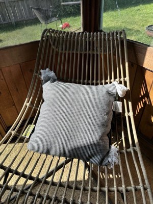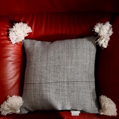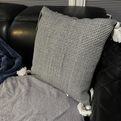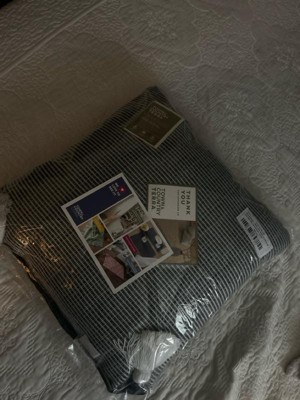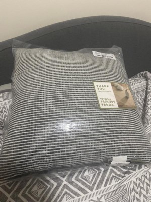[This review was collected as part of a promotion.] This pillow is large and very plush. The black lines are more prominent in person. Although this says indoor and outdoor, it is not a soft pillow to lounge on, so I would recommend for outdoor use only.