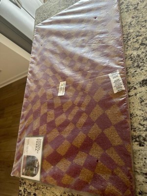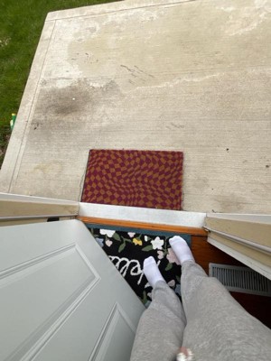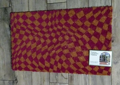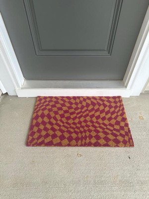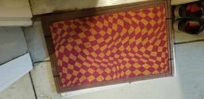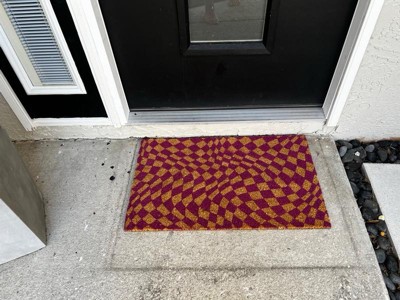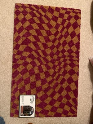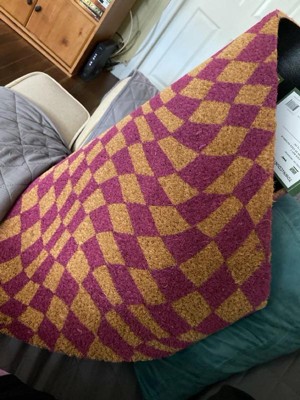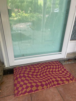 [This review was collected as part of a promotion.] This is a fun addition to the front door, with a wavy “Op art” style checkerboard pattern in natural and fuschia. The color is described as purple though to my eye, it is more of a deep hot pink, which I personally prefer. I love this material for catching dirt off shoes and cleaning gunk with a quick rub across the surface. I have this under a porch so color is nice and bright. It is regular size, not an oversized mat. I received this mat as a promotional gift for my honest review. Eye-catching and adds a much needed spark at my entry!