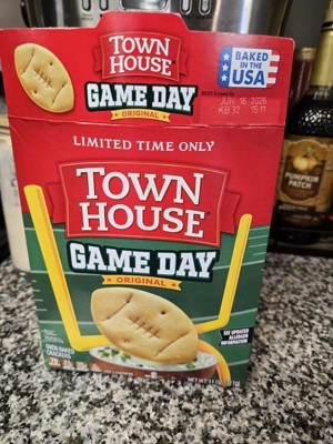 Get ready for game day with Town House Game Day Original crackers. They're the perfect snack for your football watch parties! Baked in the USA, each box delivers delicious crackers in a fun football shape. These sturdy crackers are ideal for dipping into spinach and artichoke dip, buffalo chicken dip, or seven-layer dip. Perfect for dunking, they're a low saturated fat snack (contains 3.5g total fat per serving) with no high-fructose corn syrup; Serve them during halftime, at tailgating events, or for your Super Bowl party. Add them to your game day snack spread or charcuterie board for football season gatherings. Enjoy them as a crispy, quick bite between plays. Whether you're hosting a viewing party or heading to a friend's house to watch the big game, keep a few boxes of these original buttery Town House crackers in your pantry to grab and go. Score a touchdown by serving these football-shaped treats to your guests all season long!