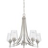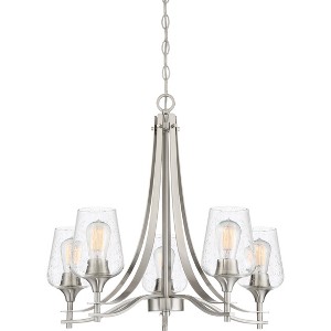 Contemporary fittings and attention to detail are the secrets to Towne's success. Tapered shades in clear seedy glass pair effortlessly with the body's brushed nickel finish for a hint of shine. Layered arms extend beyond the candle supports, contributing to the contemporary appeal, and delicate rivet details create a perfectly polished look. Towne is available as a mini pendant or as a chandelier.