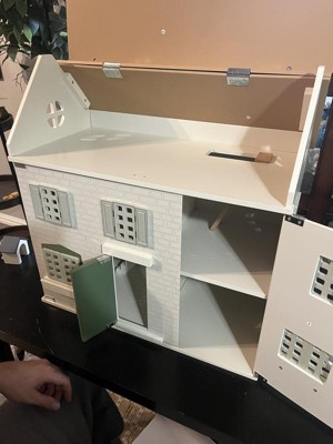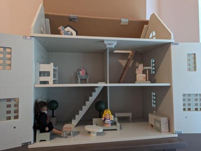 This product was part of the Hey, Bullseye sampling program and I received this product for free. I built the house in an hour from start to finish with the help of a 7 and 9 year old. The instructions were easy to follow. The house is very sturdy once all of it was put together and the screws were tightened down. The two cons with the product were that the stairs had a crack in them when received. Also there are no dolls that came with the doll house. It did come with a cat and toy wooden figure as well as lots of furniture for the house. I loved that the house closes up completely to store all of the furniture. My kids adored the house and were very excited to play with it. The color of the house was very plain so it matches any decor and looks very modern. I would definitely recommend this house for any kid!