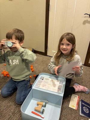 This is a fun imaginative play suitcase. The kids were loving pretending going on a trip and writing in their passport. It’s a simple but very cute set and feels nice. There is room in the suitcase for them to pack a bag a little for play.