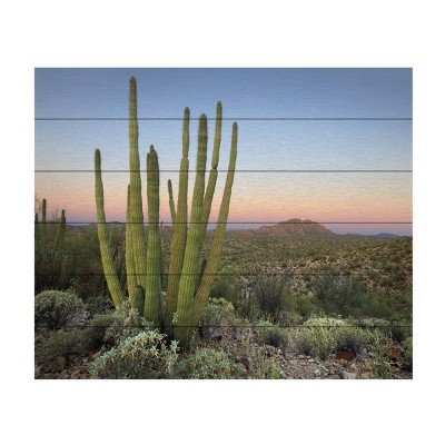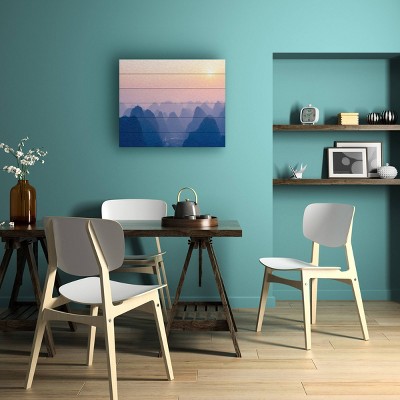 This ready to hang, Wood Slat Art by Trademark Fine Art features rows of mountains fading into the distance under a foggy orange sky. Artwork is digitally printed with high end UV inks directly onto natural hardwood planks that have been primed white for a more vibrant, colorful image. This pleasant, real wood piece highlights the texture of the wood creating a truly unique piece of art with no two pieces looking alike. The artwork arrives unframed and is ready to hang with wall hanger already installed to the back.
