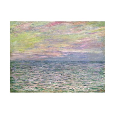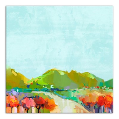 This ready to hang, gallery wrapped art piece features a lake landscape.