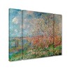 This ready to hang, gallery-wrapped multi panel canvas art set features features a spring landscape. Claude Monet was a founder of French impressionist painting, and the most consistent and prolific practitioner of the movement's philosophy of expressing one's perceptions before nature, especially as applied to plein-air landscape painting. Monet himself was enchanted by the vitality of outdoor settings as shown in many of his works. Giclee (jee-clay) is an advanced printmaking process for creating high quality fine art reproductions. The attainable excellence that Giclee printmaking affords makes the reproduction virtually indistinguishable from the original piece. The result is wide acceptance of Giclee by galleries, museums, and private collectors. Gallery wrap is a method of stretching an artist's canvas so that the canvas wraps around the sides and is secured a hidden, wooden frame. This method of stretching and preparing a canvas allows for a frameless presentation of the finished painting.