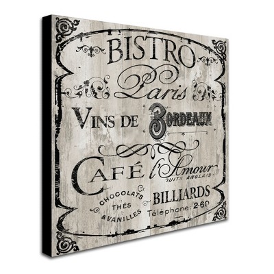 This ready to hang, gallery-wrapped art piece features a black and white vintage sign for a French bistro.Whether it's trend-right dinnerware collections, fabric,'hostess-ware'and home decor accents, gift items, wall decor or paper goods, Color Bakery is unusually diversified when it comes to designing in widely varying styles and art genres. From repeat patterns to botanicals to coastal and kitchen (food) art, Color Bakery is synonymous with diversity.Giclee (jee-clay) is an advanced printmaking process for creating high quality fine art reproductions. The attainable excellence that Giclee printmaking affords makes the reproduction virtually indistinguishable from the original piece. The result is wide acceptance of Giclee by galleries, museums, and private collectors. Gallery wrap is a method of stretching an artist's canvas so that the canvas wraps around the sides and is secured a hidden, wooden frame. This method of stretching and preparing a canvas allows for a frameless presentation of the finished painting.