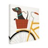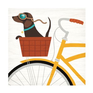This ready to hang, gallery-wrapped art piece features a dachshund wearing goggles in the basket of a yellow bicycle on a white wood background.Prominent Colors: White, Red, Yellow, Black, Tan, BlueMichael Mullan is an artist and illustrator who began his art career as a graphic designer. Following his passion for drawing, he returned to school in 2006 to get an MFA in Illustration at the Savannah College of Art and Design. With a deep appreciation for both design and illustration, his art reflects graphic and handmade qualities reminiscent of printmaking techniques and paying tribute to his hero, Andy Warhol.Giclee (jee-clay) is an advanced printmaking process for creating high quality fine art reproductions. The attainable excellence that Giclee printmaking affords makes the reproduction virtually indistinguishable from the original piece. The result is wide acceptance of Giclee by galleries, museums, and private collectors. Gallery wrap is a method of stretching an artist's canvas so that the canvas wraps around the sides and is secured a hidden, wooden frame. This method of stretching and preparing a canvas allows for a frameless presentation of the finished painting.