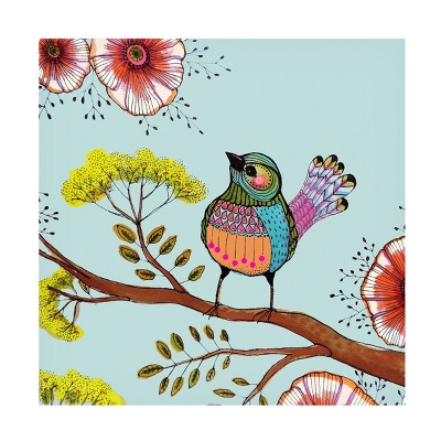 This ready to hang, gallery-wrapped art piece features a small bird among orange and pink watercolor drips.Sylvie has always been mesmerized by color. Her world is light and full of happy surprises. Living in the Greater Montreal area of Canada, she has illustrated multiple book covers for the Presses de l'Universite du Quebec. In 2011 she joined the COLOURlovers.com community and ever since has been designing pattern templates that are youthful and fresh. In 2012 she won the Gelaskins.com "Become Our New Artist" contest. Watercolor and acrylic paints help her to express her optimism and inner spontaneity. She enjoys learning new techniques and exploring her creativity.Giclee (jee-clay) is an advanced printmaking process for creating high quality fine art reproductions. The attainable excellence that Giclee printmaking affords makes the reproduction virtually indistinguishable from the original piece. The result is wide acceptance of Giclee by galleries, museums, and private collectors. Gallery wrap is a method of stretching an artist's canvas so that the canvas wraps around the sides and is secured a hidden, wooden frame. This method of stretching and preparing a canvas allows for a frameless presentation of the finished painting.Whether it's a contemporary, rustic, modern, or traditional style decor, Trademark Fine Art offers a variety of high-quality, carefully built wall art that will surely complement any style. We provide an abundance of art themes that range from fascinating abstracts to breathtaking landscapes, in an assortment of sizes that will certainly bring excitement to any area of your home. From the bedroom to the living room, or even the office, Trademark Fine Art makes professionally handcrafted, ready to hang wall decor that will be admired for years to come!